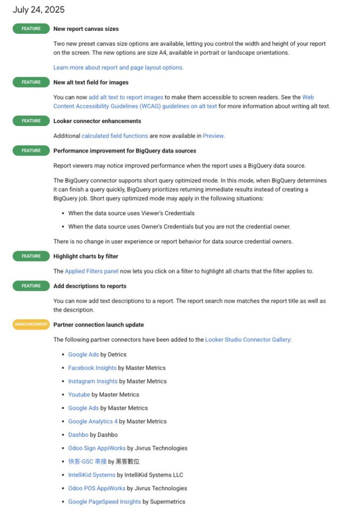 The Connector Gallery now includes integrations from Detrics, Master Metrics, Supermetrics, Dashbo, Jivrus Technologies, IntelliKid Systems, and others covering Google Ads, GA4, YouTube, Facebook, Instagram, Odoo, and more.