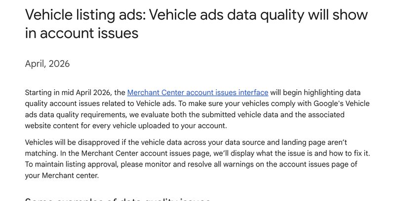 Starting mid-April 2026, Merchant Center account issues will highlight data quality issues related to Vehicle ads. Google will review both your submitted vehicle data and your website content.